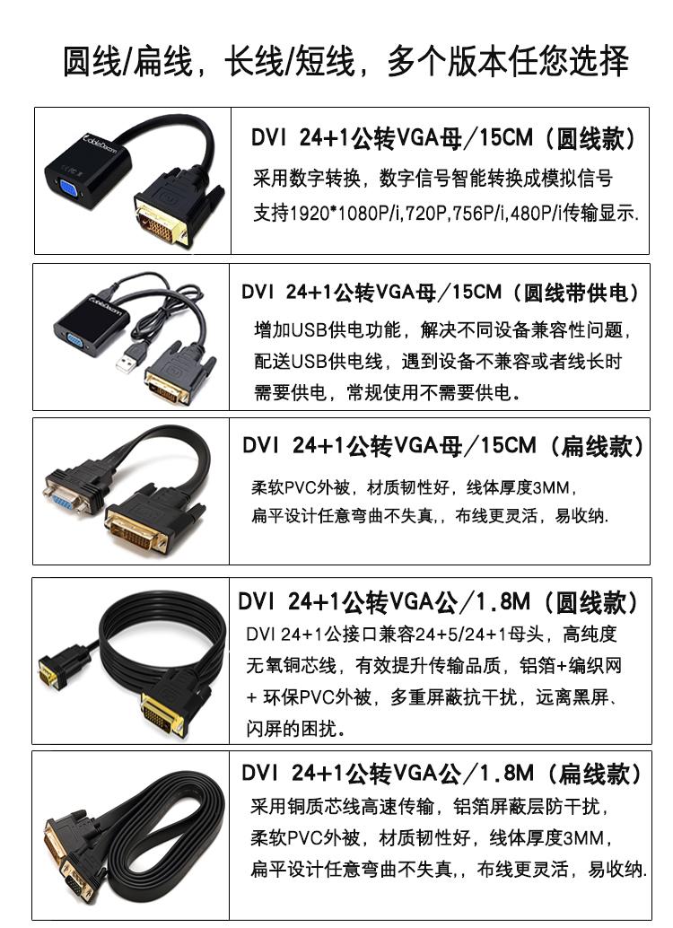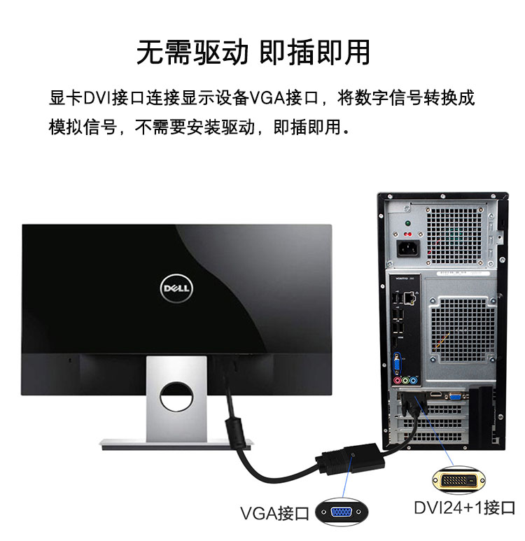 DVI24+1转VGA公对公带芯片转接线扁线电脑连显示器连接线