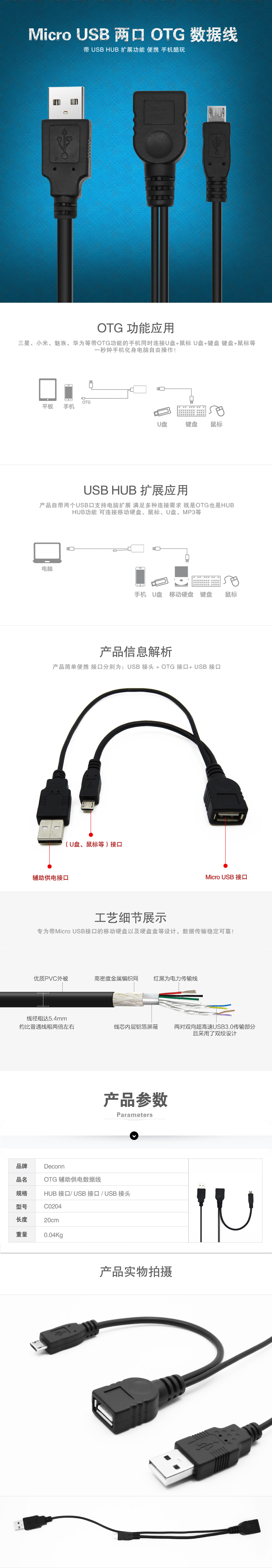 1.专为带Micro USB接口的移动硬盘以及硬盘盒等设计,数据传输稳定可靠 2.优质PVC外被 3.高密度金属编织网 4.红黑为电力传输线 5.两对双向超高速USB3.0传输部分且采用了双绞设计 6.带USB HUB 扩展功能,便携